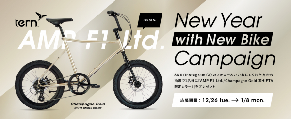 当キャンペーンは、SHIFTAのinstagramやXアカウントをフォローし、キャンペーン投稿にいいねした人を対象に、『tern/AMP F1 Ltd.(Champagne gold/SHIFTA限定カラー)」を抽選で1名様にプレゼントします。
