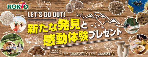 きのこ総合企業のホクト株式会社(所在地:長野県長野市、代表取締役社長 水野雅義)では、コロナ渦でなかなか実現できなかった旅行やアウトドアを応援する「新たな発見と感動体験プレゼント」キャンペーンを開催します。期間は2024年1月1日[祝・月]から3月31日[日]まで。