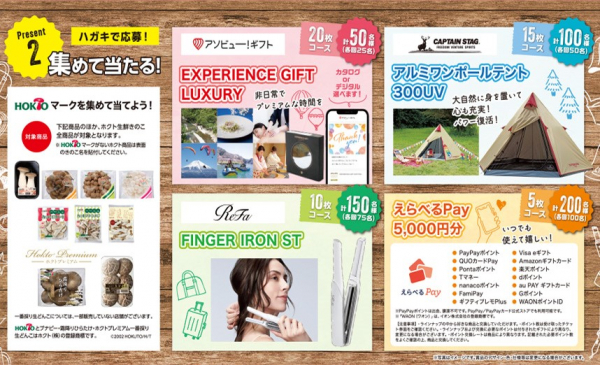 また、ホクトのきのこのパッケージに付いているHOKTOマークを必要枚数分集めて応募するコースでは、「アソビューギフト」が50名様に。「CAPTAIN STAGアルミワンポールテント」が100名様に。「リファ フィンガーアイロン」が150名様に。「えらべるPay5,000円分」が200名様に当たります。