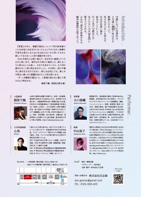 ”朗読、歌、大正琴、ピアノ、小鼓、そして色彩と流動性によってうつろいゆく現象を描くAlive Paintingで 「源氏物語」の若紫の巻を題材に 夢幻のひとときをお届けします。