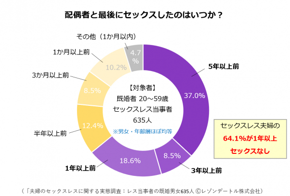 「完全レス」の人の64.1%が配偶者と1年以上セックスしておらず、うち37.0%は5年以上していないことが分かりました。長期間のレス(長期レス)が大半を占めるという結果です。