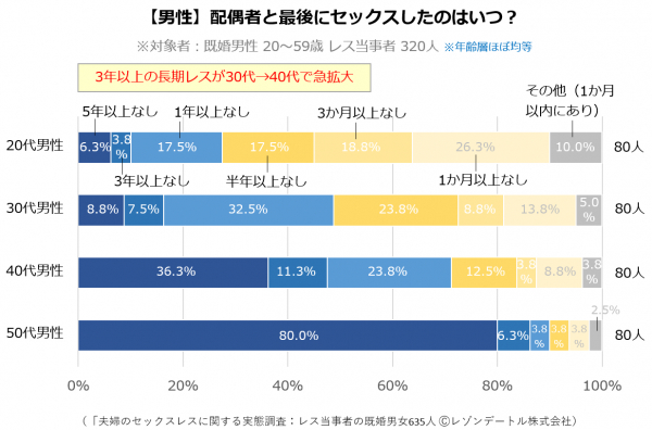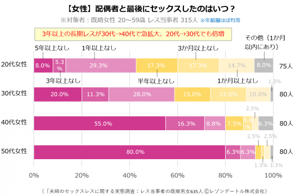 20代 → 30代 → 40代 → 50代と年齢層が上がるにつれて1年以上の長期レスの割合(ピンク帯全体)が42.6% → 59.3% → 80.1% → 92.6%と、男性と同様に漸増していきます。20代~40代は男性よりも長期レスの割合が10%高くなっているのが興味深いところです。