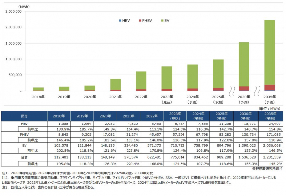 2023年の車載用LiB世界市場規模は容量ベースで前年比124.5%の775GWh、xEV(EV、PHEV、HEV)の世界生産台数増加と連動し、車載用LiB市場も拡大する見込みである。xEVタイプ別に見ると、HEVが6.7GWh(前年比124.0%)、PHEVが57.5GWh(同126.0%)、EVは710GWh(同124.4%)と推計する。