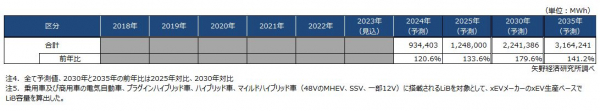 Aggrecive予測では、世界的な環境規制強化の動きと各国政府の普及政策、それに対応した自動車メーカー各社の電動化シフトを背景に、各国政府のxEV導入目標台数が概ね計画通りに実現されることを想定し、比較的高い成長率で推移するシナリオとした。Aggrecive予測における車載用LiB世界市場は容量ベースで、2025年で1,248GWh、2030年には2,241GWh、2035年では3,164GWhになると予測する。