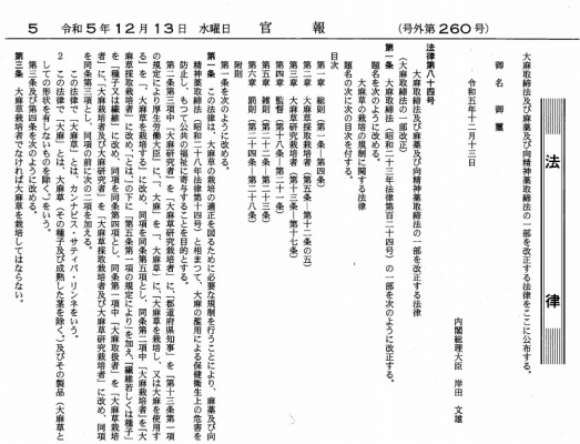 その後、23年10月24日に大麻取締法(大麻草の栽培の規制に関する法律案)、麻薬及び向精神薬取締法を一部改正する法律案を閣議決定し、衆議院及び参議院の厚生労働委員会の審議を経て両院で可決し、12月13日に官報にて公布された。