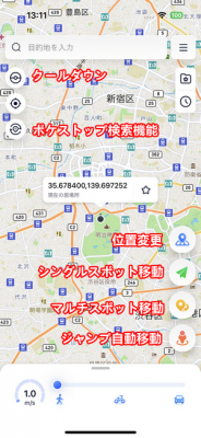 このモードでは、現在地から指定した地点に向けて好きな速度で移動させることができます。徒歩や自転車、車など、指定した移動方法に対して適切な経路で移動するので、不自然さは全くありません。