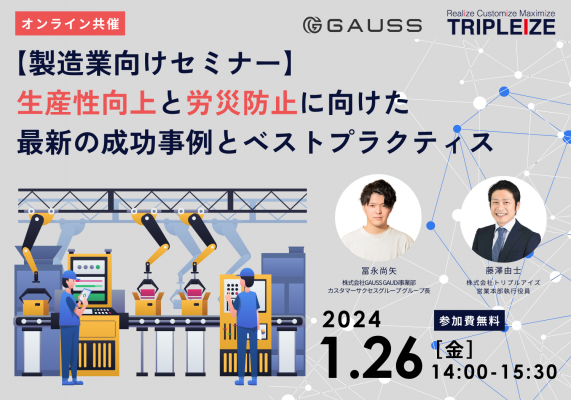2024年1月26日(金)、株式会社トリプルアイズ(本社:東京都千代田区、代表取締役:山田 雄一郎、東京証券取引所グロース市場《証券コード:5026》、以下トリプルアイズ)と株式会社GAUSS(東京都渋谷区、代表取締役:宇都宮 綱紀、以下GAUSS)は、「生産性向上と労災防止に向けた最新の成功事例とベストプラクティス」と題して、製造現場のDX推進ご担当者、安全管理ご担当者向けの無料ウェビナーを開催いたします。