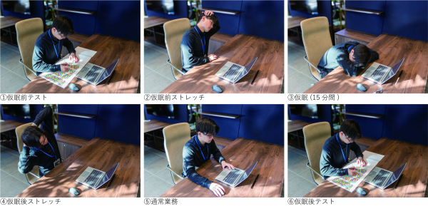 個室やベッドなどの環境・設備は用意せず、又仕事の合間に行うことを想定して、日常的に業務を行うデスクで仮眠を取ることでも充分な仮眠効果を得られるのかを検証する。