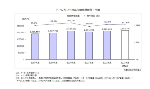 2022年度の国内トイレタリー市場規模(メーカー出荷金額ベース、5分野50品目)は、前年度比102.8%の2兆1,196億3,800万円となり、2兆円規模を維持するとともに前年度を上回った。