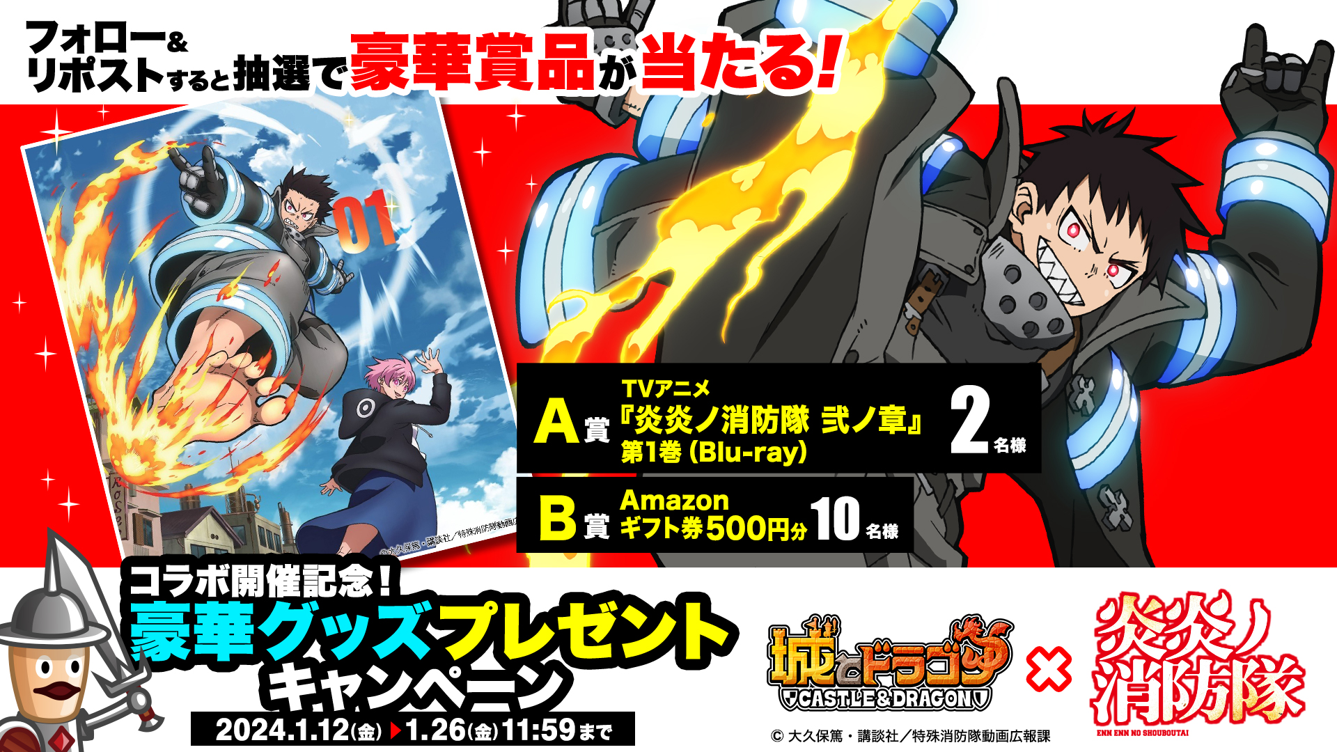 1月12日(金)より、コラボ開催を記念した「コラボ開催記念!豪華グッズプレゼントキャンペーン」を実施いたします。『城とドラゴン』公式X(旧Twitter)アカウントをフォローし、対象ポストをリポストしていただいた方の中から抽選で、TVアニメ『炎炎ノ消防隊』のBlu-rayやAmazonギフト券(500円分)をプレゼント!たくさんのご参加お待ちしております。