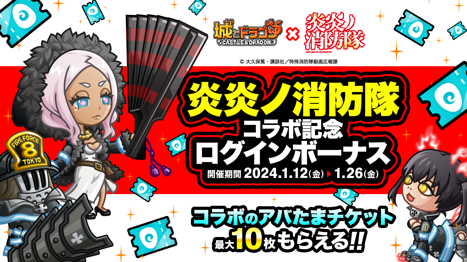 『炎炎ノ消防隊』とのコラボイベント開催を記念して、「コラボのアバたまチケット」最大10枚などがもらえる「ログインボーナス」を開催いたします。コラボのアバたまチケットを使ってコラボ限定キャラを手に入れましょう!