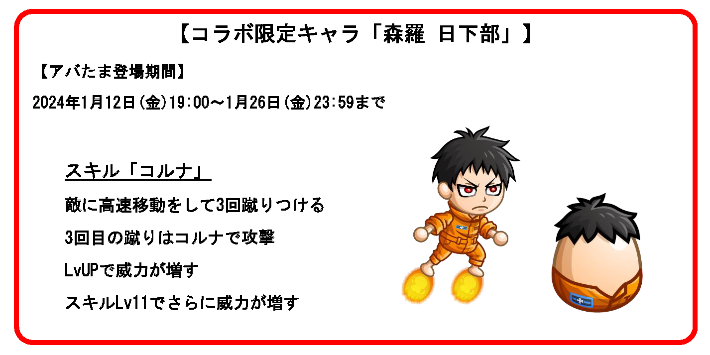 1月12日(金)より、TVアニメ『炎炎ノ消防隊』との復刻コラボイベントを開催いたします。期間中は、「森羅 日下部」がコラボ限定キャラとして「コラボのアバたま」に登場。今回新たに「森羅 日下部」の激レアお着替え「火事場の馬鹿力」や、プリンセスの激レアお着替え「プリンセス火華セット」が登場!期間限定のコラボイベントをぜひお楽しみください。