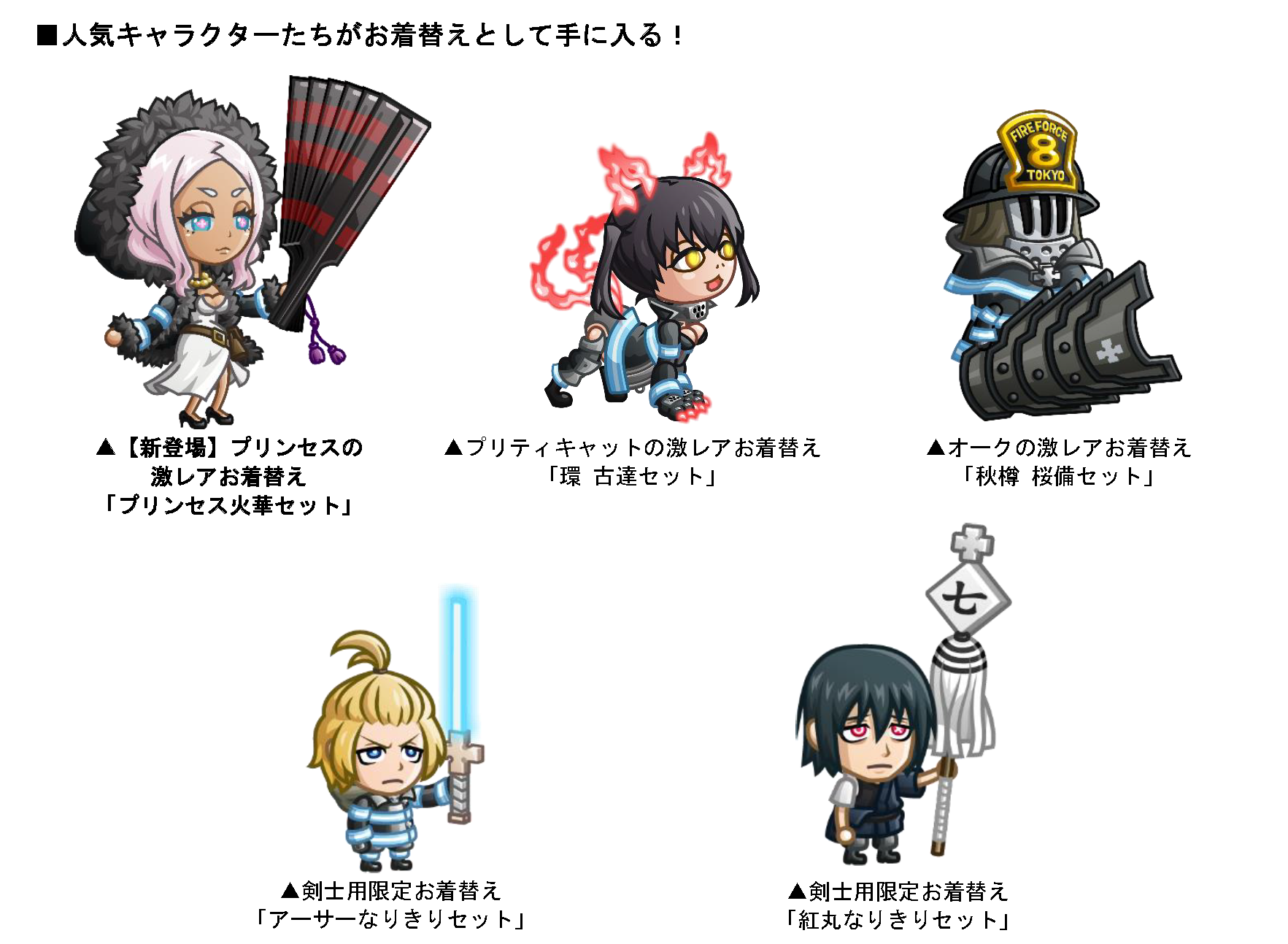 また、剣士用コラボ限定お着替え「アーサーなりきりセット」「紅丸なりきりセット」、プリティキャットの激レアお着替え「環 古達セット」、オークの激レアお着替え「秋樽 桜備セット」のほか、新しくプリンセスの激レアお着替え「プリンセス火華セット」も登場しますので、アバたまを割って、コラボ期間中にしか手に入らない限定キャラタマゴやアイテムを手に入れましょう!