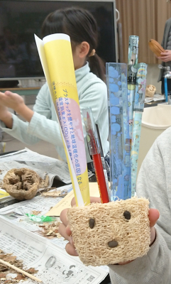 脱プラへの取り組みとして、ヘチマたわしやペン立てを作りました。