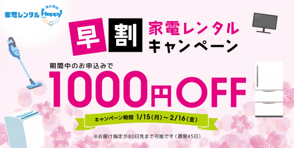 昨今、新生活に向けた準備を早めに行う方が増えてきています。そこで今回は一足先に”早割キャンペーン”を1月15日から実施いたします。キャンペーン期間中に家電レンタルをお申込みいただくと、ご購入金額から1,000円の割引をいたします。