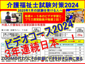 そこで、一般社団法人外国人介護職員支援センター(千葉県市川市、代表理事 井上文二)では、オンデマンド動画基本学習(196本)と復習動画学習(100本)で合計300時間以上の学習カリキュラムに加え、別コースで毎週2回開催するリアルZOOM復習授業への聴講参加サービスをオプションで追加した新しい試験対策コースを2月1日に開講(途中参加可)します。特定技能外国人など、頑張る外国人は施設の勤務に一切迷惑をかけずに合格を目指せます。