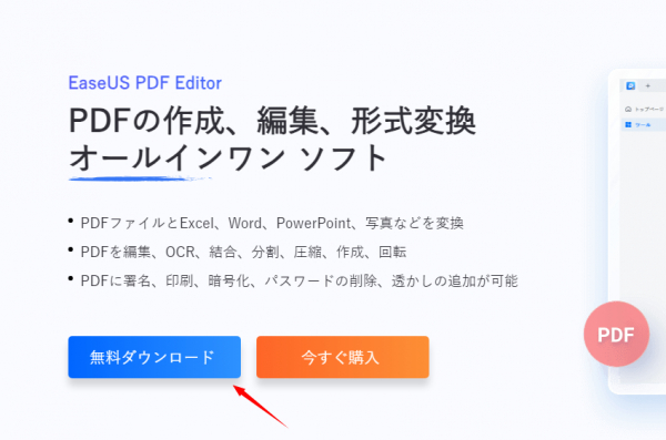 ステップ1.EaseUS PDF Editorの公式ページに入り、「無料ダウンロード」をクリックします。