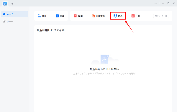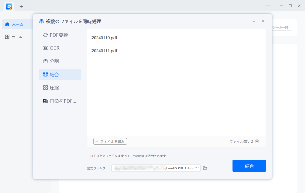 ステップ2.インストール完了後のEaseUS PDF Editorを起動し、メニューで「結合」をクリックして、結合したいファイルを選択します。