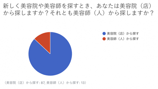 新しく美容院や美容師を探す際の探し方について、“美容院(店)から探す”が87%、“美容師(人)から探す”が13%という結果でした。