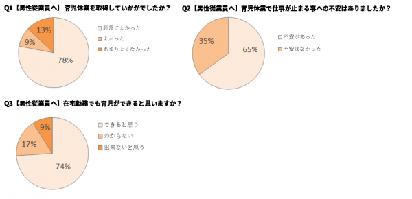 取得した男性従業員からは、取得して良かったという回答が多く寄せられた。一般的に男性は出産間もない時期の育児の経験が少ないので、その時期の大変さや喜びを家族で共有できたことを喜ぶ回答コメントがあった。