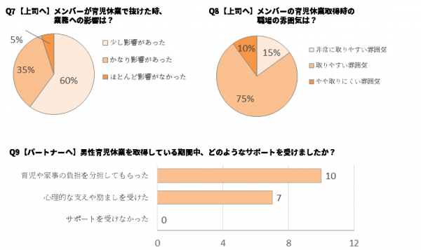 Q6の結果にもあったように、育児休業を取得することについては良い雰囲気の傾向ではあるが、上司の視点からは業務の負荷が高くなることを心配している職場の雰囲気も感じていると思われる。そのため、休業取得者の業務をフォローするメンバーへ特別手当を設けるなどの制度の改定を求める声もあった。