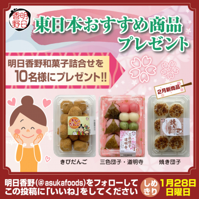応募された方の中から抽選で10名様に東日本で人気の季節の和菓子、甘いお団子に濃いきな粉をまぶした「きびだんご」、三色団子と道明寺の組み合わせが楽しめる「三色団子・道明寺」、とろりとのびる黒蜜をたっぷり詰め込んだ「焼き団子」をセットにしてプレゼントいたします。