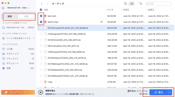 Step 3.スキャン後、左側で「種類」または「パス」を選択することが可能です。そして、削除されたファイルもプレビューできます。確認後、復元したいファイルをチェックして、「復元」ボタンをクリックします。保存すると、復元の作業が完了です。