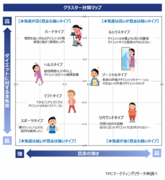 ◆当レポートでは、ダイエットに対する考え方やダイエットの取り組み、ダイエット対策商品の利用実態、情報源などについて調査。さらに性別、年齢層別に加えて、「リバウンドタイプ」「ハードタイプ」「ルックスタイプ」「ソーシャルタイプ」「ヘルスタイプ」「ソフトタイプ」「スポーツタイプ」の7つのクラスターでも分析している。