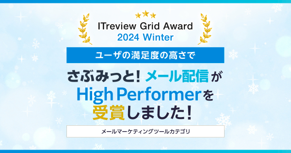 “おもてなしを科学する”株式会社イー・エージェンシー(本社:東京都千代田区、代表取締役:甲斐真樹)が提供する自社プロダクトブランド「さぶみっと!」の1つである、メール配信ツール「さぶみっと!メール配信」は、2024年1月18日に発表されましたアイティクラウド社主催の「ITreview Grid Award 2024 Winter」において、ユーザーから高い評価を受け、メールマーケティングツールカテゴリーでHigh Performerを受賞しました。