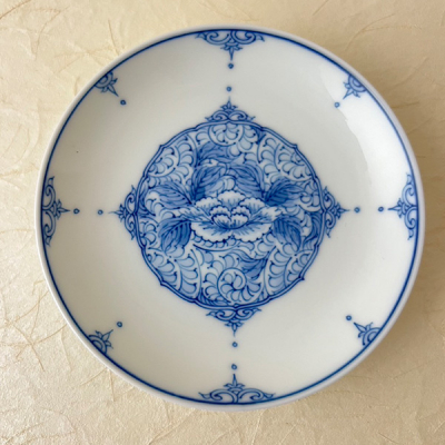 長崎の伝統工芸「三川内焼」の人気体験シリーズ。平戸松山窯が得意とする優美な染付の牡丹唐草を施した豆皿に「濃み(だみ)」という技法で、お好きな箇所を塗っていただきます。