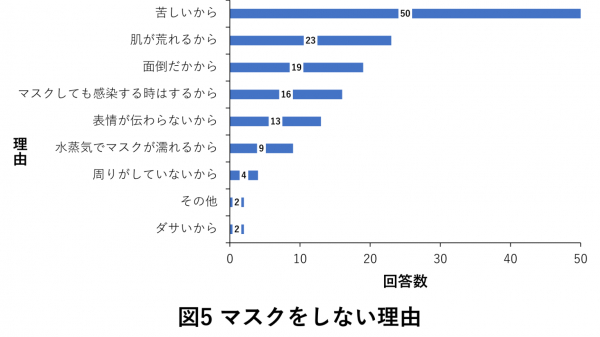 マスクをしたいと思わない理由については、「苦しいから」との回答が多くみられました。中には、肌荒れを懸念してつけない
