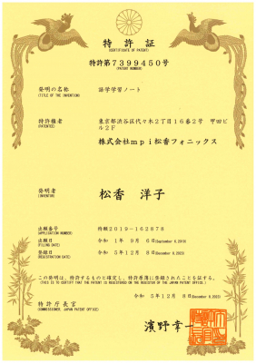 英語教育44年の株式会社mpi松香フォニックス(創立:1979年、代表者:竹村千栄子、以下mpi)の「考える→書く→伝える」の3つのステップでコミュニケーションにつながる、新しい考え方から生まれたライティング教材TAGAKIが語学学習ノートとして認められ、2023年12月8日に特許を取得したことを2024年1月22日に発表いたします。