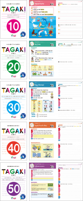 「考える」⇒「書く」⇒「伝える」を繰り返しながら、自分の意見を持ち英語を書けるようになる、全く新しいスタイルの英語ライティング教材です。TAGAKIを日本語で表記すると「多書き」です。単語ばかり100回書くとか、自分が言いたいことに関係のない英文を文法理解のために10回書いておぼえる、というような「多書き」ではありません。TAGAKI(10)から(50)まで5段階があり、各レベルで30のトピックを「考えて→書く→伝える」を繰り返すことで学習者は英語面でもメンタル面も成長してゆきます。