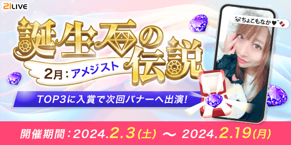 営するエンターテイメント・ライブ配信アプリ【21LIVE(ニーイチライブ)】URL: https://21.live では、2月3日(土)から2月19日(月)にかけて誕生石アイテム・アメジストの獲得数を競うランキングイベントを開催いたします。