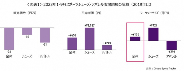 スポーツシューズ・アパレル市場規模、2023年1-9月は19年同期比135億円増