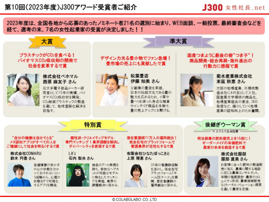 国内最大級の女性経営者データベースサイトを運営する女性社長.net((株)コラボラボ企画・運営 本社:東京都千代田区 代表取締役:横田響子)は、全国の個性あふれる女性起業家・経営者を表彰する「J300アワード」の受賞者7名を2024年1月23日に発表しました。