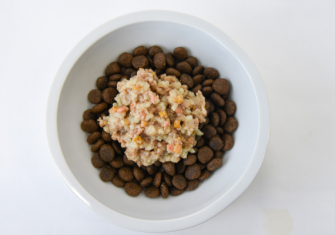 原材料名 チキン(皮付きモモ肉)、白米、チキンレバー、ライスパウダー、カボチャ、ニンジン、オリゴ糖、鶏脂肪、中鎖脂肪酸(MCT)、トマト、菜種油、こんにゃく粉、卵殻カルシウム、タウリン、魚油(マグロ・イワシ・カツオ)、昆布、フェカリス菌、ミネラル類(K、Mg、Zn、Se、Fe、Mn、Cu)、ビタミン類(C、E、B12、B1、B2、D3)