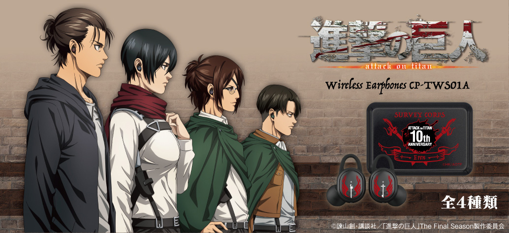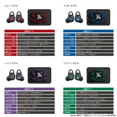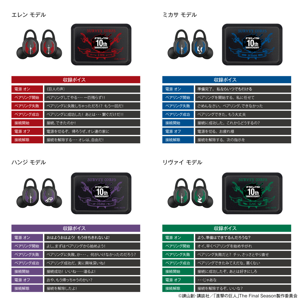 本コラボレーションモデルは「エレンモデル」「ミカサモデル」「ハンジモデル」「リヴァイモデル」の4種類。充電ケース天面は各キャラクターのイメージアイコンを装飾した10周年記念オリジナルデザイン、左右ハウジングに関しても各キャラクターのイメージアイコンによるオリジナルデザインにて作品の世界観を表現。描き下ろしイラストデザインパッケージに、「エレン・イェーガー」「ミカサ・アッカーマン」「ハンジ・ゾエ」「リヴァイ・アッカーマン」による音声ガイダンス搭載のコラボレーションモデルとなっております。