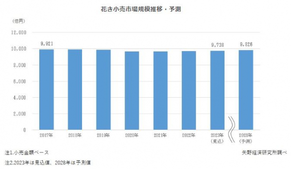 花き類の末端市場は、2023年は9,738億円(前年比100.1%)を見込む。新型コロナウイルスの感染症法上の位置づけが5類に移行したことにより人流が戻り始め、イベント需要や業務需要は回復基調にあるが、市場全体は、コロナ以前の水準には戻り切っていない見通しである。