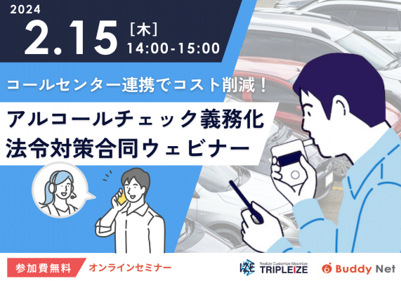 2024年2月15日(木)、AI顔認証によるアルコール検知システム「AIZE Breath」(https://aizebreath.jp/)を提供する株式会社トリプルアイズ(本社:東京都千代田区、代表取締役:山田 雄一郎、東京証券取引所グロース市場《証券コード:5026》、以下トリプルアイズ)と24時間365日の有人アルコールチェック代行サービス(https://www.buddynet.jp/contactcenter)を提供する 株式会社バディネット(本社:東京都中央区、代表取締役社長:堀 礼一郎氏、以下バディネット)は、「白ナンバー事業者のアルコールチェック義務化」に関する合同ウェビナーを開催いたします。