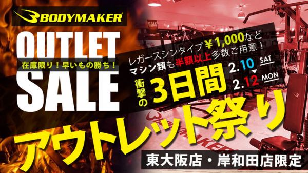 BODYMAKER BMアスリートショップ東大阪店・岸和田カンカンベイサイドモール店では、2月10日(土)-12日(月・祝)3日間限定で、トレーニングマシンアウトレットセールを開催します。ジムでもお使い頂けるレベルのマシンも半額以上の割引価格に!トレーニー必見!是非この機会にご来店下さい。完売次第終了です。
