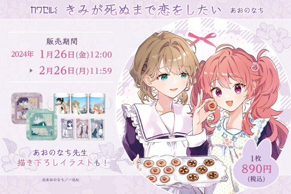S賞:アクリルブロックは「シーナ」と「ミミ」がクッキーを焼いているワンシーンを描いた「カワセルくじ」だけの限定描き下ろしイラストを使用!その他の賞も、表紙イラストや作中から厳選したコマを使用したデザインとなっており、「きみが死ぬまで恋をしたい」の世界観を存分にお楽しみいただけます。