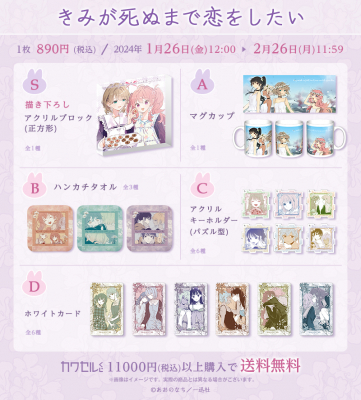 株式会社インクルーズ(東京都渋谷区、代表取締役社長 山﨑 健司)が企画・運営するフィジカルグッズのオンラインくじ「カワセルくじ」にて、1月26日(金)より、「きみが死ぬまで恋をしたい」のくじが販売開始になりましたことをご報告させていただきます。