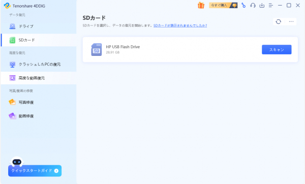 1.Tenorshare 4DDiG を起動します。復元したい SD カードをコンピュータに接続します。