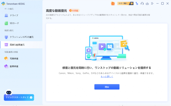 1.Tenorshare 4DDiG を起動します。メイン画面で「高度な動画復元」を選択して、「開始」をクリックして、動画の保存場所を選択します。