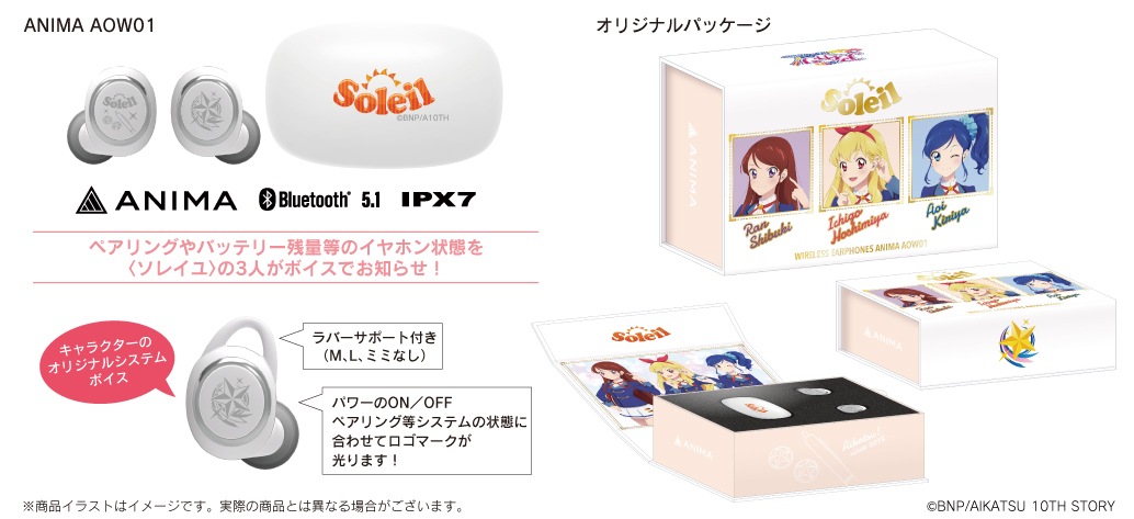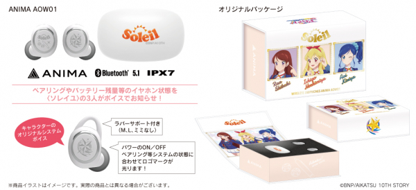 本コラボレーションモデルは、充電ケース天面にSoleilロゴを印刷、左右ハウジングには「スターライト学園校章」と「Soleilロゴ」と作品のビジュアルのモチーフをイメージしたレーザー加工をし、起動時にLED点灯します。音声ガイダンスはSoleilの3人、「星宮いちご」「霧矢あおい」「紫吹 蘭」の録り下ろしボイスを搭載。電源オンやオフ、ペアリング時やタップ音等、計17ワードの内容となっており、パッケージのイラストはイヤホンを装着したSoleil3人の描き下ろしです。
