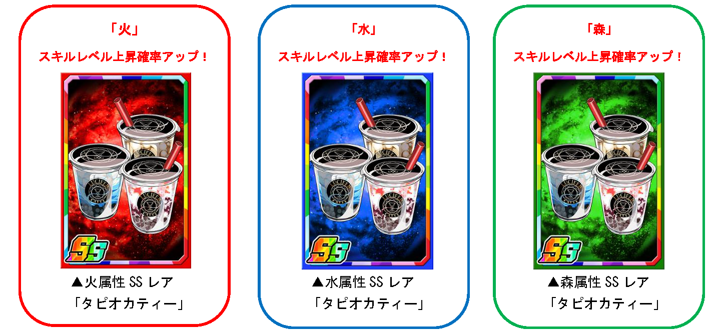 「ワルプルギスP」を使い素材ガチャを回すと、限定強化素材「タピオカティー」を手に入れることができます。一部のモンスターに使うと強化値2倍の効果があるほか、火・水・森のスキルレベル上昇確率もアップします。