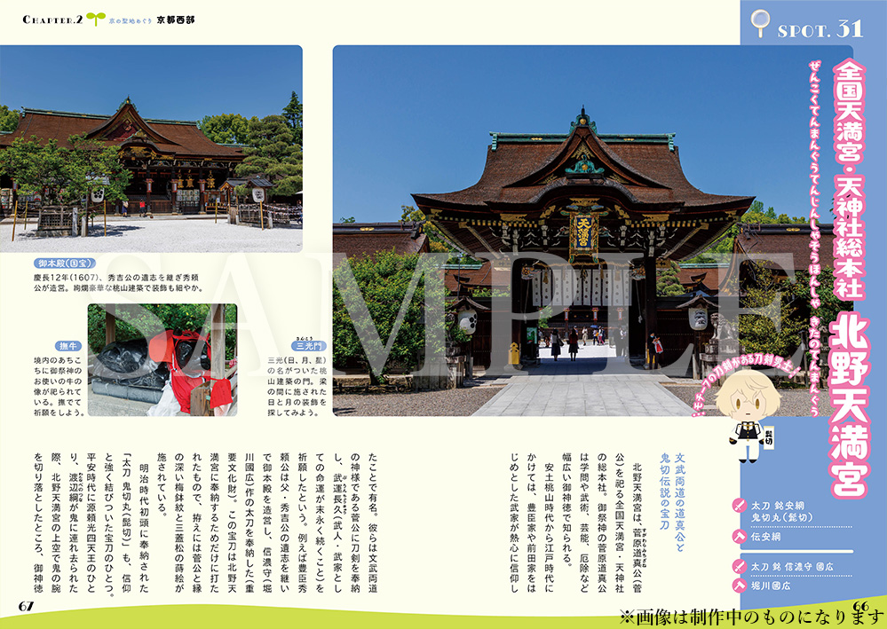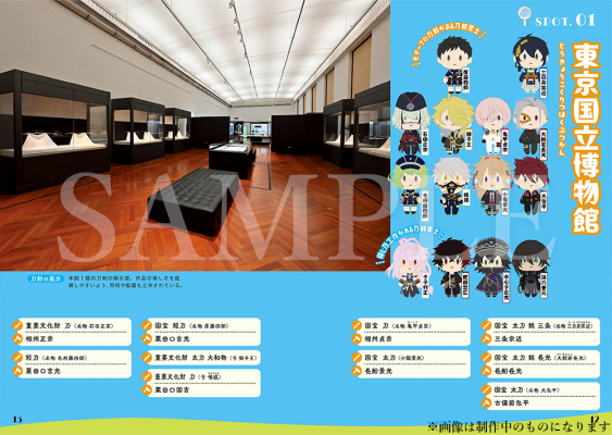 刀剣男士のモチーフとなった刀剣の所蔵施設はもちろん、刀剣男士・刀工にゆかりのある地を多数ご紹介。それぞれの刀剣男士に関連するスポットにはゲーム中の「御伴散歩」機能でお馴染みの可愛いイラストを掲載しております!