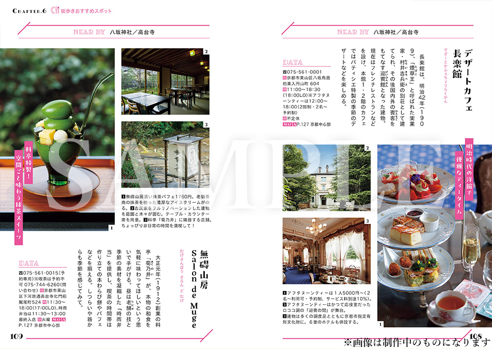 参照しやすいようエリア分けした地図はもちろん、京都在住のライターが、各スポットを楽しむのに必要な所要時間と移動に必要な移動時間の目安を調べたモデルコースも掲載しているので、京都ビギナーも安心です!
