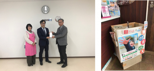 右:ヨシハラクリーニング イオンタウン彦根店にて学生服を回収する寄付ボックス